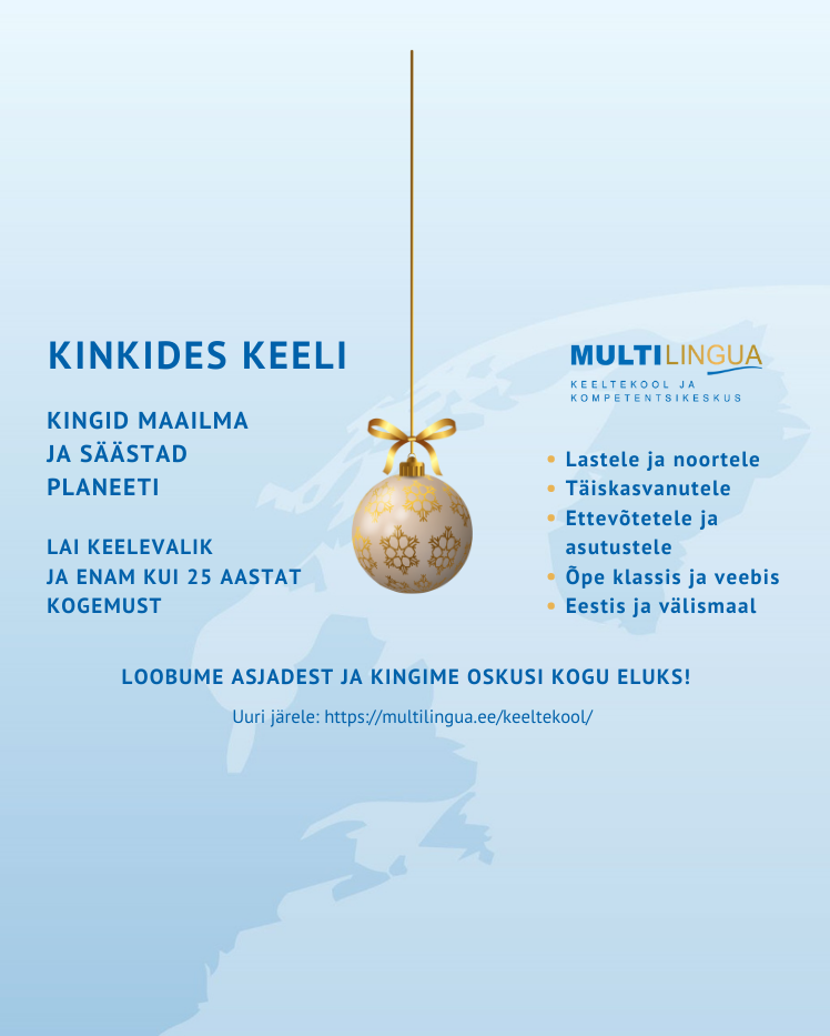 Teeks sel aastal teisiti! Kingiks endale, sõpradele, lähedastele ja töökaaslastele hoopis võimaluse uut keelt õppida! Või juba õpitut täiendada! Sellisel moel säästame loodust ja kingime midagi, mis ei vanane, on alati kaasas, aitab suhelda ja avab tee uute võimaluste ning kultuurideni.